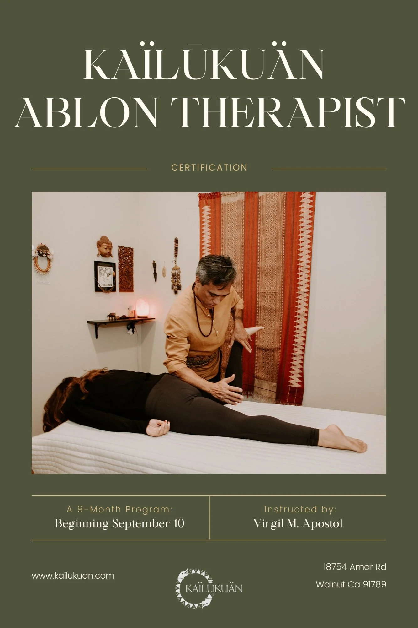 KaÏlūkuän Combat and Healing Arts is excited to present the Ablon Therapist Certification Program! This is an extensive, 9 month course resulting in the accumulation of over 20 years of research, development, clinical practice, and dissemination of Ablon by founder Virgil Mayor Apostol, author of "Way of the Ancient Healer: Sacred Teachings from the Philippine Ancestral Traditions" (North Atlantic Books, 2010).